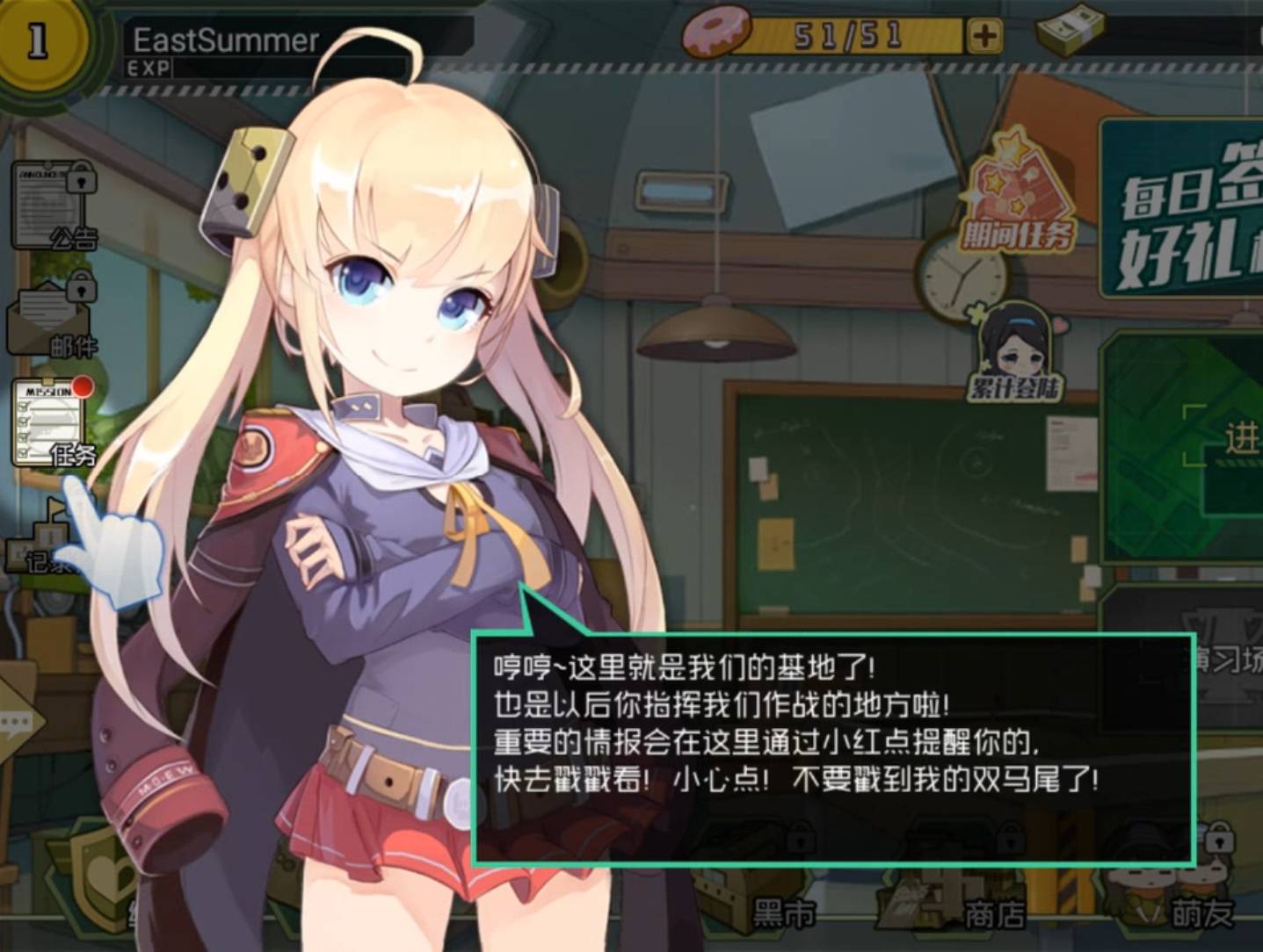 双马尾少女:□□吗?真是很普通呢……记好了,本元帅就是堂堂的萌军最高统帅阿呆芙元帅殿下,从今天起,□□,你就是本元帅的见习指挥官了!